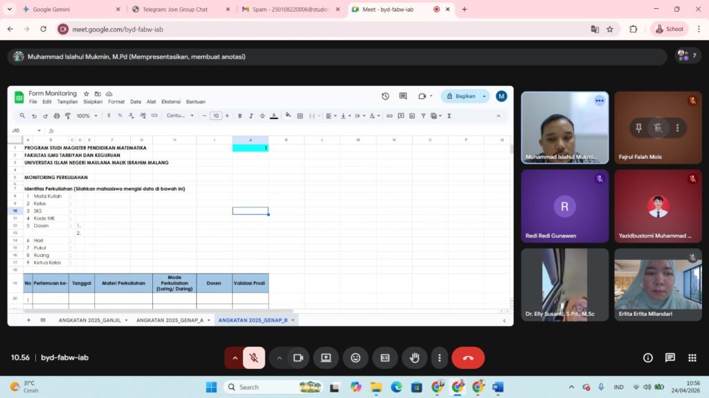 MALANG – Dalam upaya menjaga konsistensi kualitas layanan akademik dan transparansi proses pembelajaran, Program Studi Magister Pendidikan Matematika Universitas Islam Negeri (UIN) Maulana Malik Ibrahim Malang menyelenggarakan Forum Komunikasi Ketua Kelas, Jumat (24/4/2026). Kegiatan yang dilaksanakan secara daring (online) ini menjadi wadah strategis bagi mahasiswa untuk menyampaikan aspirasi langsung kepada pengelola program studi. Forum ini […]